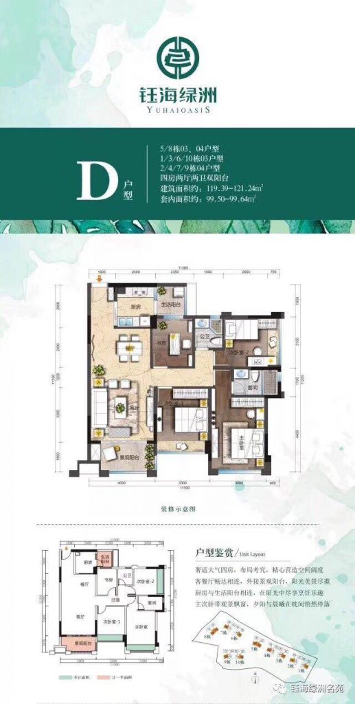 钰海绿洲:在售建面约99-121㎡二至四房,毛坯均价9300-9800元/㎡ ,带装均价10500元/㎡,项目自身配套时尚风情商业街,集餐饮、休闲、娱乐、购物等于一体,举步享受丰盛商业配套,满足您足不出小区的便捷需求。